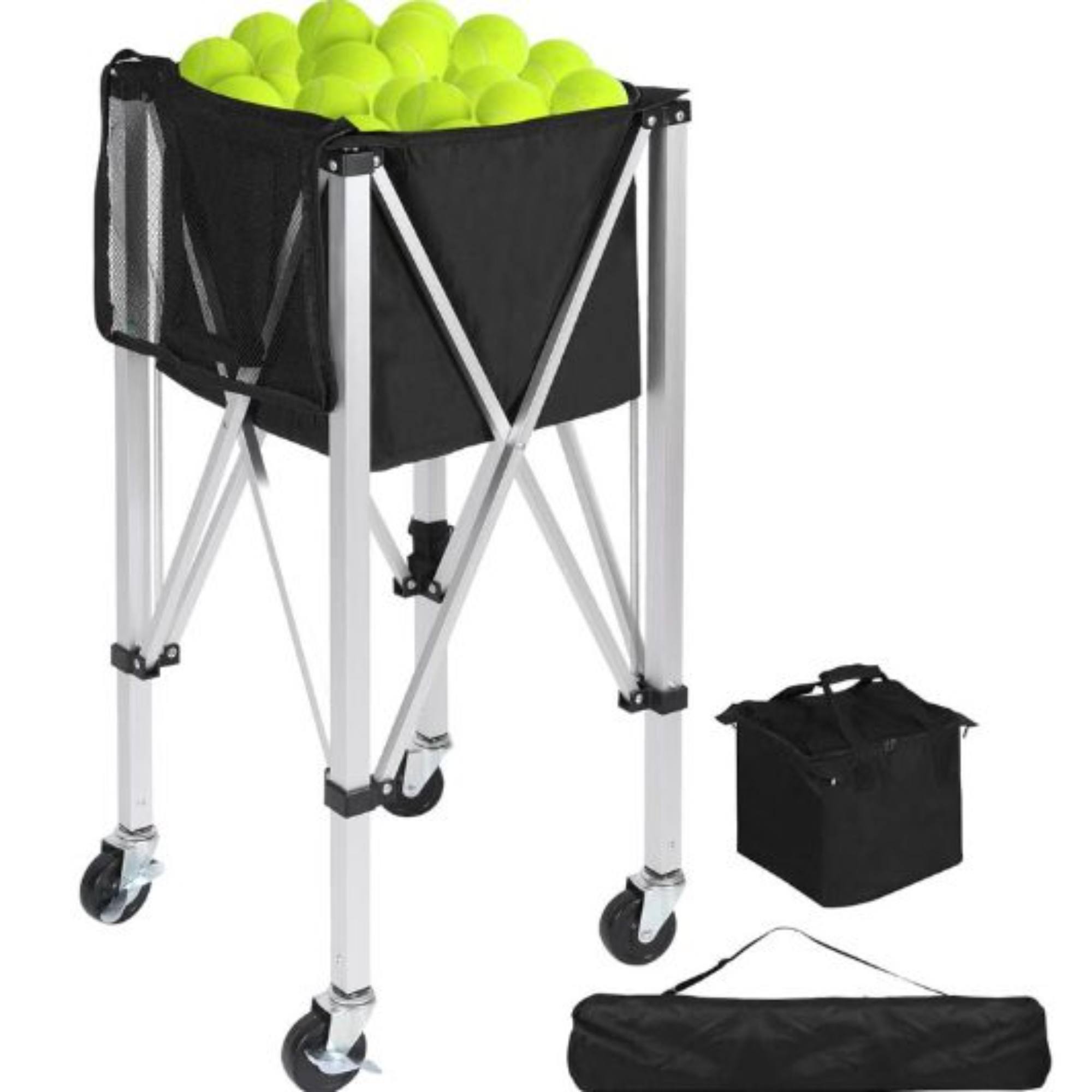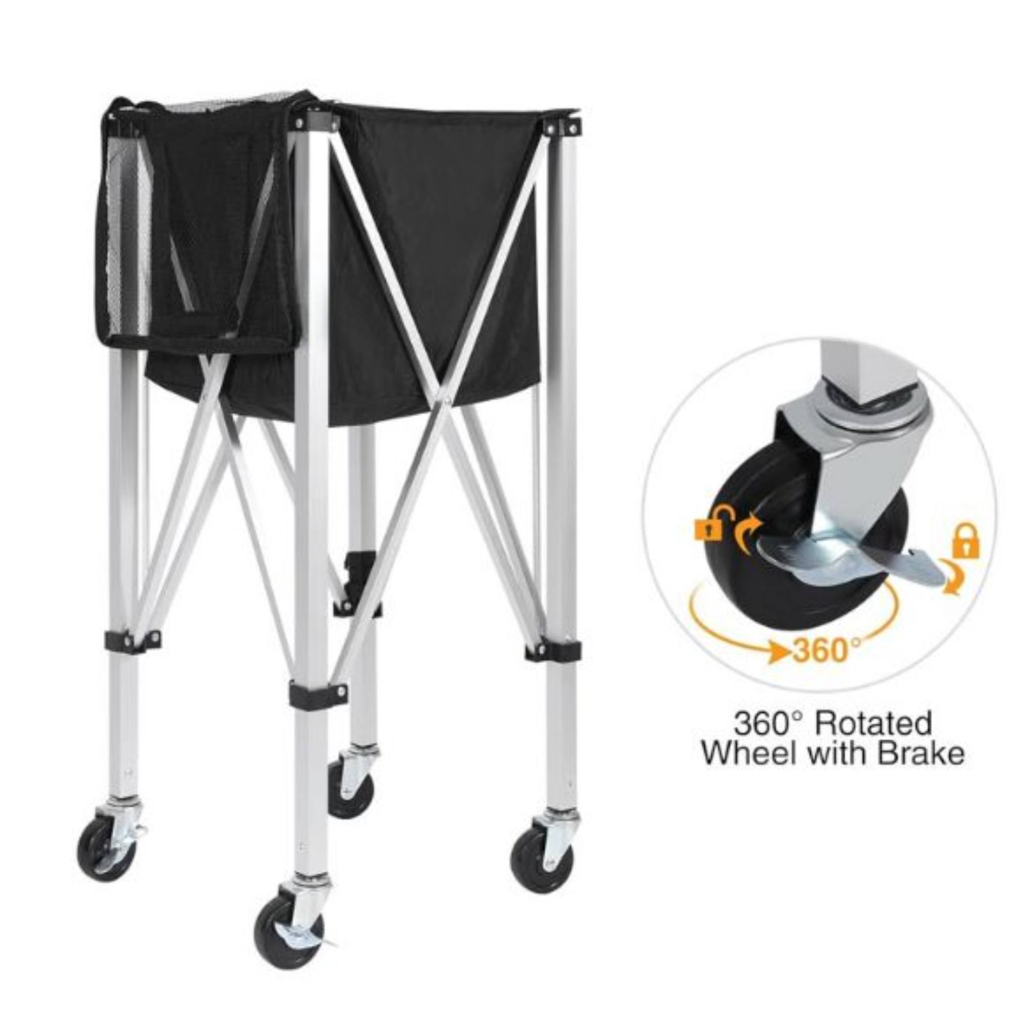 Suitable for Tennis, Pickleball or Padel Balls, this ball coaching trolley has a heavy-duty folding alloy frame with braked wheels and a removable 150 ball Oxford fabric storage bag with see through zipped mesh top and 2 hand zipped side pockets. Easy to set up and folds away into a handy Oxford fabric carrying bag.