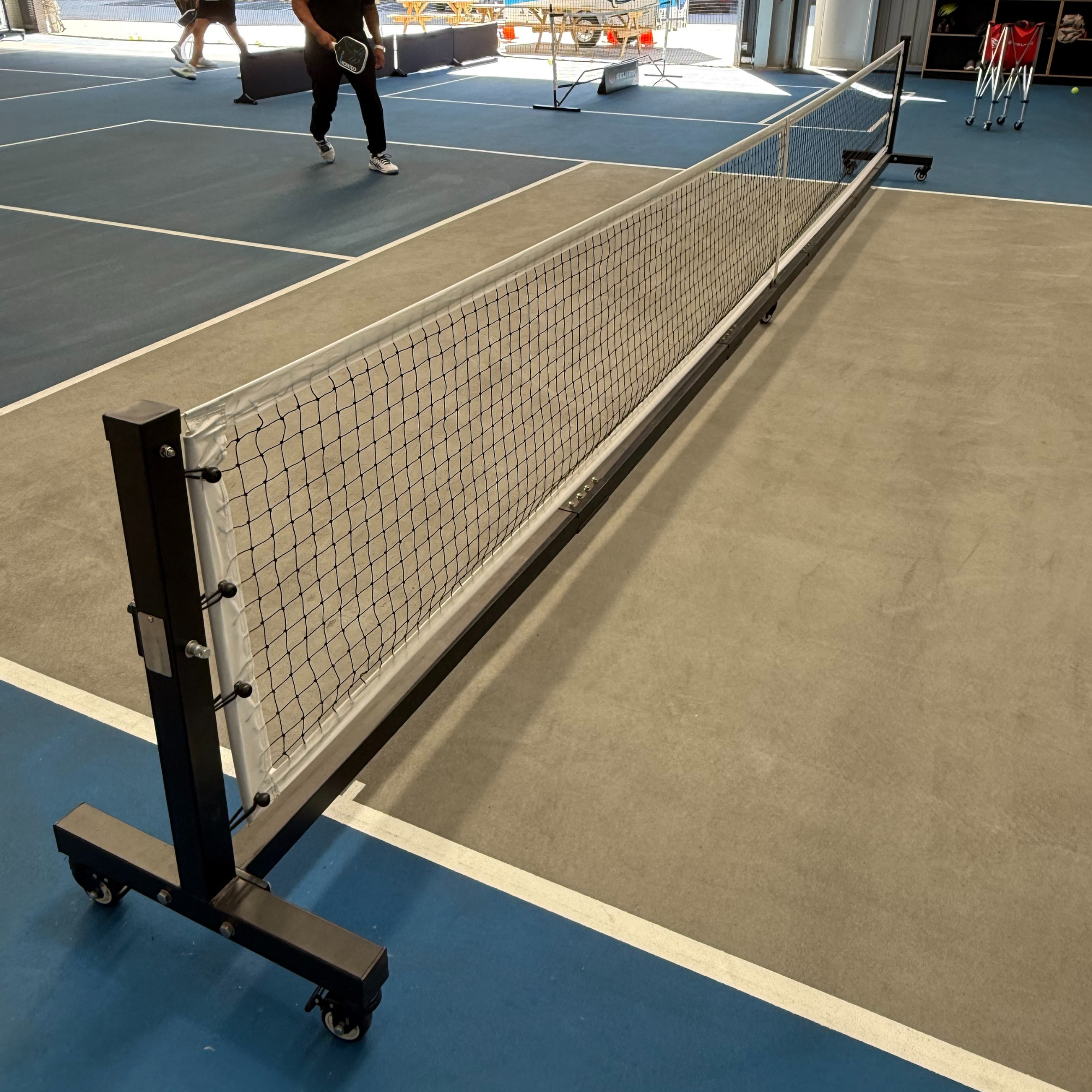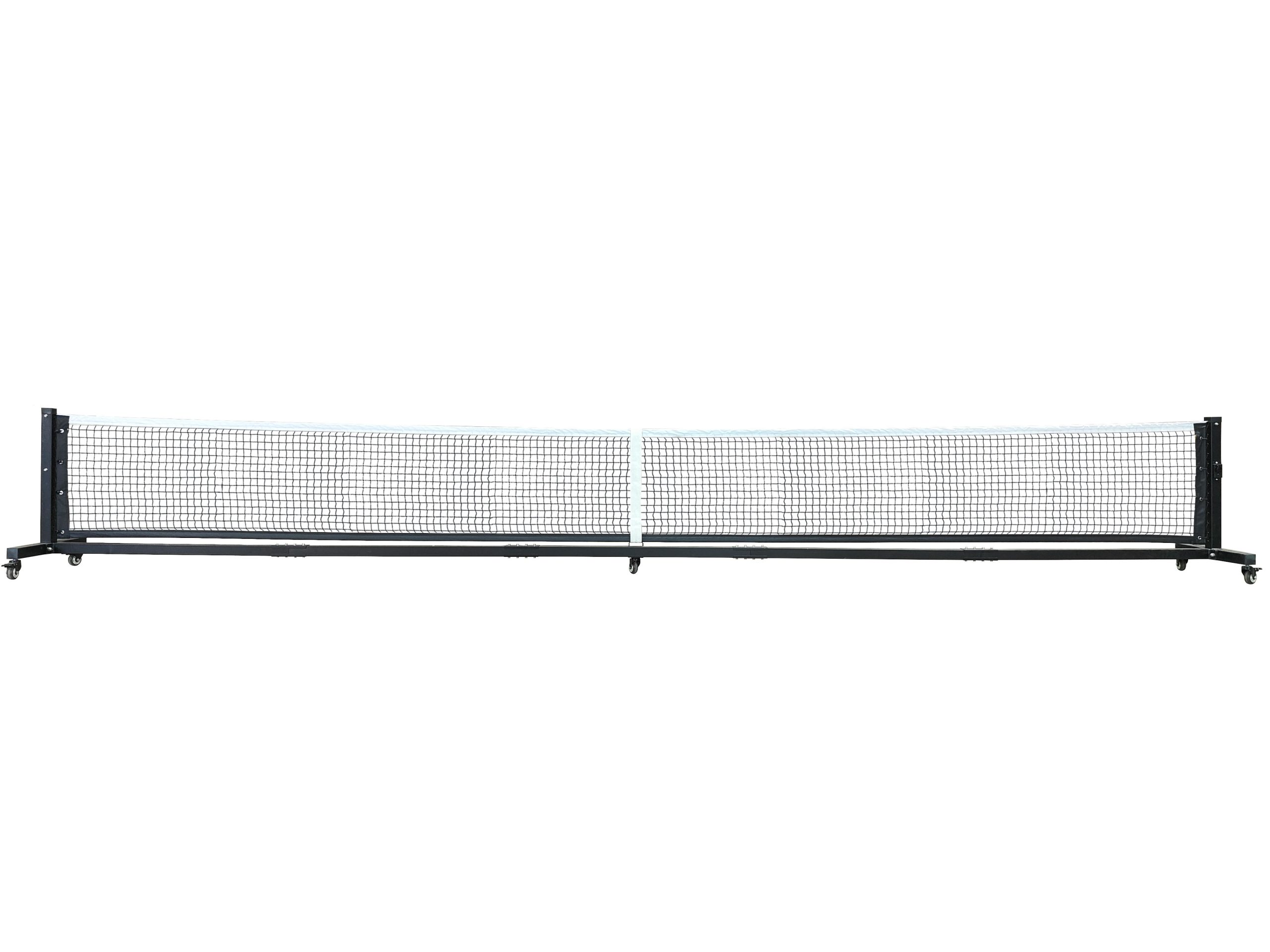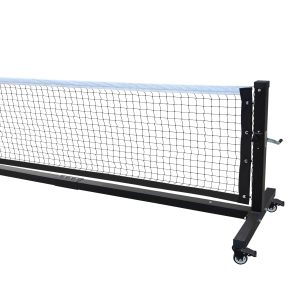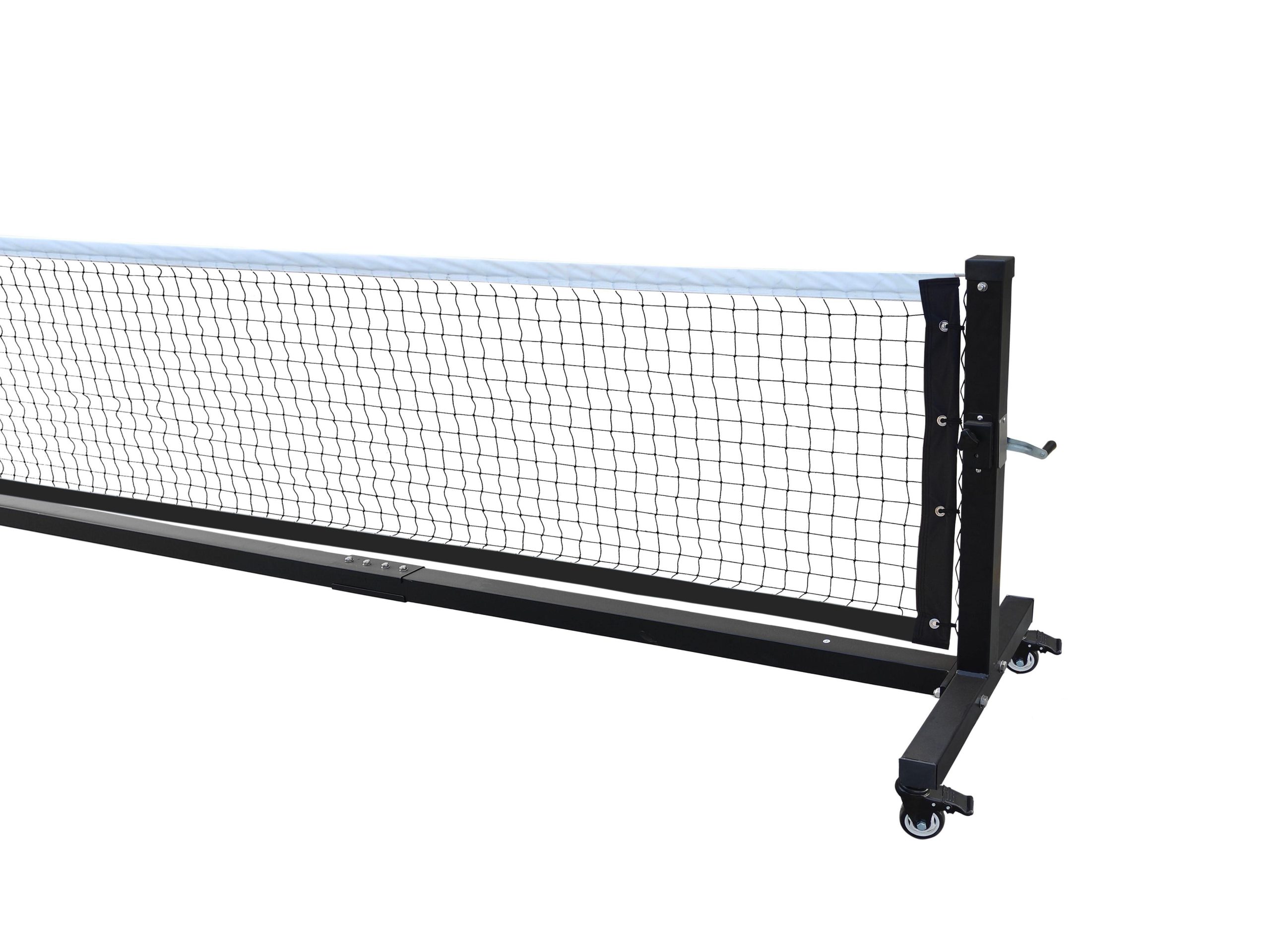 The official pickleball net height is 34 inches (85cm) in the middle and 36 inches (90cm) at the sidelines. The width is 22 feet (660cm), which allows for a foot (30cm) of clearance on either side of the 20-foot (600cm) court