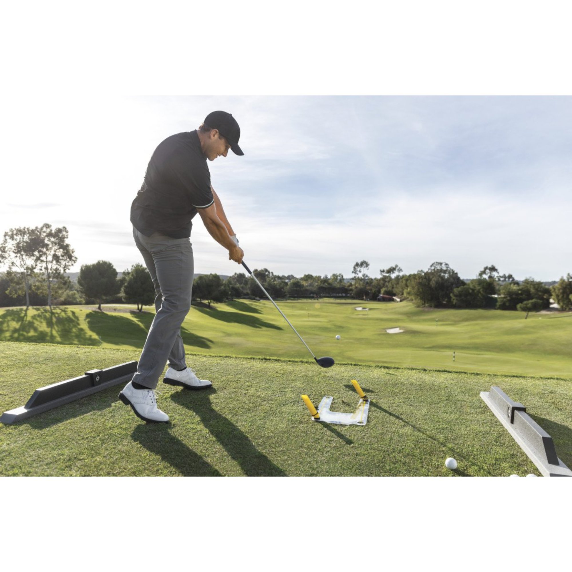 The SKLZ Swing Guide Trainer helps develop a more reliable swing for improved accuracy and increased distance on the green. Built with composite guides that provide instant feedback on swing path and plane, athletes will know the second they aren’t accurate. A bungie system helps prevent the guides from flying away on impact, so they won’t get lost. The guides are also removable to attach and reattach to easily change their position for training any shot. The trainer is designed with alignment markers that will help build and reinforce proper setup and ball position to play better on the green. The ultra-durable polycarbonate base can withstand countless swings and weather elements.